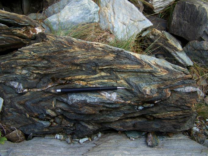 Keywords: Mutilayer folds.JPG Isoclinal folds in a multilayer dolomite vs chlorite schist at the Passo del Lucomagno/Lukmanierpass Switzerland Own 2007-10 Woudloper Schist Folds Geology of Switzerland