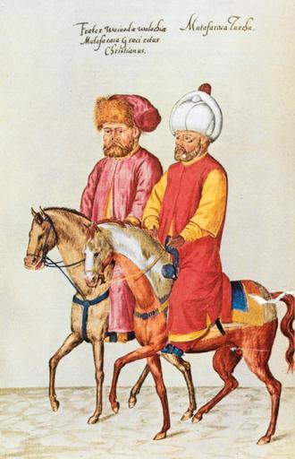 Keywords: Muttafar Aghas.png en The two muttafar aghas ushers of the Ottoman court to the left the Greek Orthodox and to the right the Turk 2011-06-15 Γεννάδειος Βιβλιοθήκη Ιστορία του ελληνικού έθνους - Τόμος Ι' - Ο ελληνισμός υ ό ξένη κυριαρχία ερίοδος 1453-1669 σελ 30 Unknown early 16th-century artist PD-Art Uploaded with UploadWizard People of the Ottoman Empire in art People of the Ottoman court Aghas of the Ottoman Empire Ottoman Greeks |
