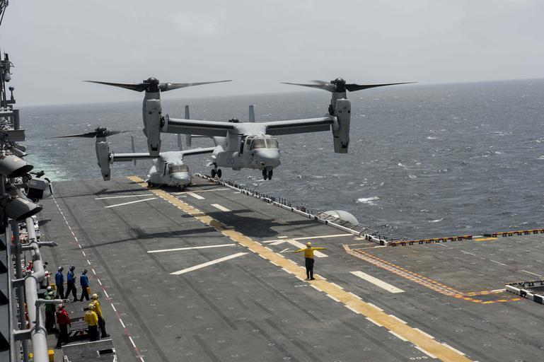 | Keywords: MV-22B of VMX-22 landing on USS America (LHA-6) in July 2014.JPG en An Boeing MV-22B Osprey aircraft assigned to Marine Operational Test and Evaluation Squadron VMX 22 Argonauts transports visitors from Trinidad and Tobago to the U S Navy amphibious assault ship USS America LHA-6 America was transiting through the U S Southern Command and U S 4th Fleet area of responsibility 2014-07-25 140725-N-MD297-003 Navy http //www navy mil/view_image asp id 182004 U S Navy photo by Mass Communication Specialist 3rd Class Huey D Younger PD-USGov-Military-Navy MV-22B Osprey USMC in hovering VMX-22 Aboard USS America LHA-6 |