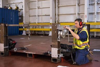 | Keywords: MV Cape Ray 140617-N-XB010-001.jpg en Eric Copeland a chemical operator for Edgewood Chemical Biological Center aboard MV Cape Ray repairs a crank that will help move drums containing chemical agent to feed into the Field Deployable Hydrolysis System for neutralization on the ship during an exercise in operating the FDHS Cape Ray is tasked with the neutralization of specific chemical materials from Syria in accordance with the Organization for the Prohibition of Chemical Weapons guidelines while operating in international waters 2014-06-17 ECBC https //www dvidshub net/image/1433586 140617-N-XB010-001 2014-07-03 10 03 NAVAL STATION ROTA ES PD-USGov-Military-Navy Ships at Naval Station Rota Images from DoD uploaded by Fæ |