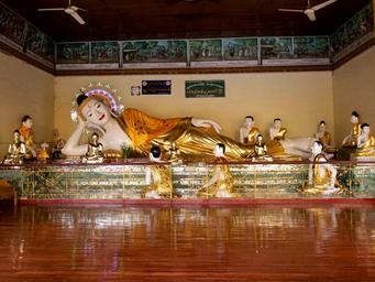 Keywords: architecture asia bâtiment birman birmanie buddhist burma golden myanmar pagodas rangoon rangoun shwedagon sky stupa temple www.wbayer.com wwwwbayercom indoor La pagode est située à 2 km du centre ville de Yangon, au n°1, Shwedagon Pagoda Road. Elle repose sur une plate-forme pavée de marbre de 5,6 hectares, au sommet de la colline de Singuttara, à 51 m au-dessus de la ville. Elle domine l'horizon. On y accède par des escaliers et des ascenseurs situés aux quatre points cardinaux. Deux chinthes (lions mythiques) monumentaux gardent l'entrée sud ; ils ont été offerts par roi Tharrawaddy lors de sa visite en 18418. La pagode principale se trouve au milieu d'un vaste complexe de 72 autres pagodes, pagodons, salles de prières, tazaungs, pyatthats9 et autres édifices religieux à l'architecture typiquement birmane, ainsi que de très nombreuses statues de bouddhas et de nats. Le stûpa atteint la hauteur de 98 mètres. Sa base est faite de briques recouvertes de milliers de plaques d'or. Elle est entourée d'une forêt de 64 petits pagodons10 qui forment une petite enceinte avec 4 temples plus grands situés aux points cardinaux. Sur la flèche se trouve une sorte d'ombrelle, appelée le hti en birman où sont accrochées 1065 clochettes d'or et 420 clochettes d'argent11, ainsi qu'une girouette ornée de pierres précieuses. Elle se termine par le seinbu, une petite sphère d'or incrustée de milliers de diamants12 dont une émeraude13 de 76 carats. La pagode est située à 2 km du centre ville de Yangon, au n°1, Shwedagon Pagoda Road. Elle repose sur une plate-forme pavée de marbre de 5,6 hectares, au sommet de la colline de Singuttara, à 51 m au-dessus de la ville. Elle domine l'horizon. On y accède par des escaliers et des ascenseurs situés aux quatre points cardinaux. Deux chinthes (lions mythiques) monumentaux gardent l'entrée sud ; ils ont été offerts par roi Tharrawaddy lors de sa visite en 18418. La pagode principale se trouve au milieu d'un vaste complexe de 72 autres pagodes, pagodons, salles de prières, tazaungs, pyatthats9 et autres édifices religieux à l'architecture typiquement birmane, ainsi que de très nombreuses statues de bouddhas et de nats. Le stûpa atteint la hauteur de 98 mètres. Sa base est faite de briques recouvertes de milliers de plaques d'or. Elle est entourée d'une forêt de 64 petits pagodons10 qui forment une petite enceinte avec 4 temples plus grands situés aux points cardinaux. Sur la flèche se trouve une sorte d'ombrelle, appelée le hti en birman où sont accrochées 1065 clochettes d'or et 420 clochettes d'argent11, ainsi qu'une girouette ornée de pierres précieuses. Elle se termine par le seinbu, une petite sphère d'or incrustée de milliers de diamants12 dont une émeraude13 de 76 carats. |