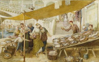 Keywords: Myles Birket Foster The fish market on the steps of the Rialto Bridge.jpg The fish market on the steps of the Rialto Bridge Venice Signed with monogram watercolour heightened with bodycolour 43 x 67 cm Exhibited in 1875 http //www bonhams com Bonhams by 1875 Creator Myles Birket Foster PD-old-100 Images from Bonhams Myles Birket Foster Paintings of fish markets Paintings of people of Venice Paintings of Ponte di Rialto |