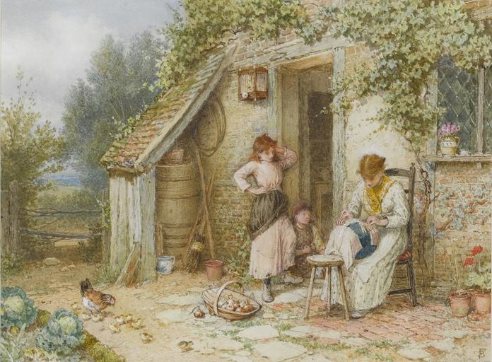Keywords: Myles Birket Foster A lacemaker c1888.jpg A lacemaker Signed with monogram watercolour over pencil heightened with bodycolour 20 5 x 27 5 cm http //www bonhams com Bonhams ~ 1888 Creator Myles Birket Foster PD-old-100 Images from Bonhams Myles Birket Foster 1888 paintings Bobbin lacemaking in art |