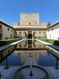 Keywords: myrtle court nasridenpalast alhambra spain andalusia granada world heritage moorish architecture building town castle old fortress castle courtyard water fountain reflexes mirroring mirror image symmetrical