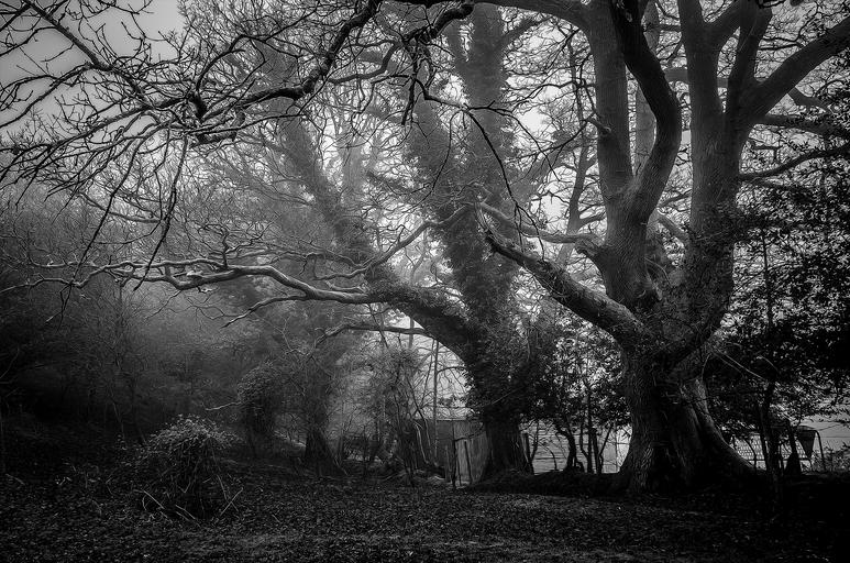 Keywords: mystic trees foggy misty forest nature mystery autumn dark forest spooky garden black and white mood gloomy vegetation flora season