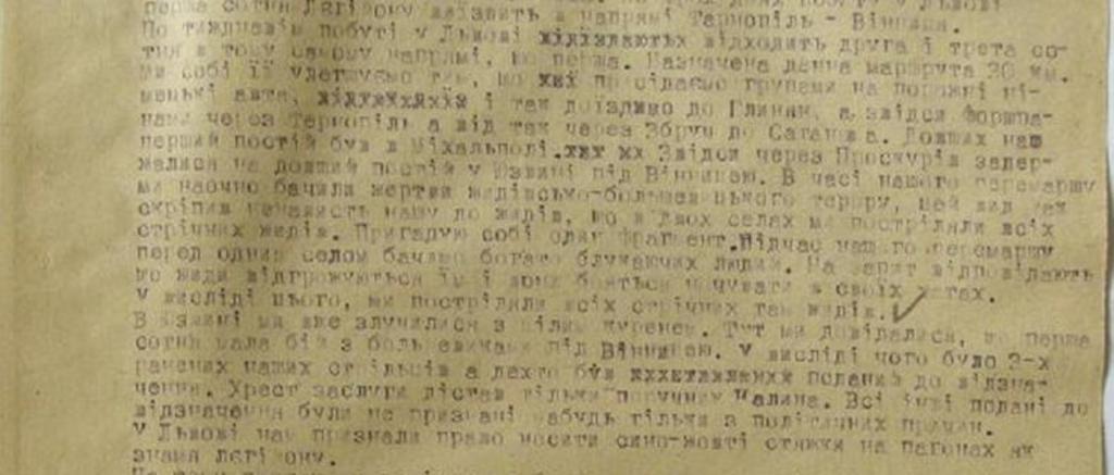 Keywords: Nachtigall Battalion report about extermination of Jews in Vinnytsia, Ukraine, in July–August 1941.jpg A report by a member of the w Nachtigall Battalion about the activities of the unit in July August 1941 that is the extermination of Jews in the Vinnytsia Oblast Ukraine The text of the report in Ukrainian language Ukrainian reads as follows Пе ша сотня Легіону заїздить у нап ямі Та нопіль- Вінниця По тиждневім побуті у Львові відходить д уга і т етя в тому самому нап ямі що пе ша П изначена денна ма ш ута 30 км и собі її улегшуємо тим що посідаємо г упами на по ожні німецькі авта і там доїздимо до Глинак а звідси фо шпанами че ез Те нопіль а від так че ез Зб уч до Саганів с Довшах наш пе ший постій був у іхальполі Звідси че ез П оску ів заде жалися на довший постій в Юзвіні під Вінницею В часі нашого пе ма шу ми наочно бачили же тви жидівсько-большовицького те о у цей вид теж ск іпив ненависть нашу до жидів що в двох селах ми пост іляли всіх ст ічних жидів П игадую собі один ф агмент Під час нашого пе ма шу пе ед одним селом бачили багато блукаючих людей а запит відповідають що жиди відг ожуються їм і вони бояться ночувать у своїх хатах У висліді цього ми пост іляли всіх ст ічних там жидів В Юзвіні ми вже злучилися з цілим ку енем Тут ми довідалися що пе ша сотня мала бій з більшовиками під Вінницею У висліді чого було 3-х анених наших ст ільців а дехто був поданий до відзначення Х ест заслуги дістав тільки по учик Калина Всі інші подані до відзначення були не п изнані мабудь тільки з політичних п ичин У Львові нам п изнали п аво носити синьо-жовті стяжки на погонах як знамя легіону Цент альний де жавний а хів вищих о ганів влади та уп авління Ук аїни ЦДАВО Ф 3833 Оп 1 Сп 157- Л 7 Ukrainian nationalist Stepan Bandera 's Organization of Ukrainian Nationalists OUN-B Sluzhba_Bezpeky security service 1944 PD-Ukraine cc-by-sa-3 0 GFDL Bandera's OUN Ukrainian Legion The Holocaust in Ukraine |