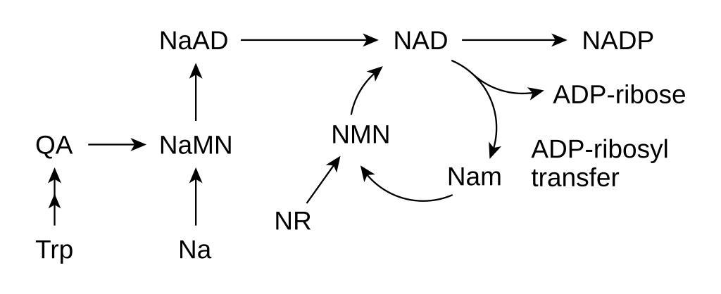 | Keywords: NAD metabolism.svg validSVG NAD+ and NADP+ metabolism Created using http //www acdlabs com/download/chemsk html ACD/ChemSketch 10 0 and w Inkscape ;Legend Trp tryptophan QA quinolinic acid Na nicotinic acid NaMN nicotinic acid mononucleotide NaAD nicotinic acid adenine dinucleotide NAD nicotinamide adenine dinucleotide NADP nicotinamide adenine dinucleotide phosphate NR nicotinamide riboside NMN nicotinamide mononucleotide Nam nicotinamide ADP-ribose adenosine diphosphate ribose Vector version of w Image NAD metabolism png by Tim Vickers 2007-12-09 Fvasconcellos 20 31 9 December 2007 UTC w Image NAD metabolism png by Tim Vickers Metabolic pathways Nicotinamide adenine dinucleotide |