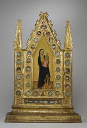 | Keywords: Naddo Ceccarelli - Reliquary Tabernacle with the Virgin and Child - Walters 371159.jpg  Naddo Ceccarelli a talented follower of Simone Martini ca 1284-1344 was one of a handful of painters to create reliquaries that emulated the work produced by goldsmiths The format that Ceccarelli adopted in this painting is filled with allusions to works traditionally executed in other media particularly those that combined architecture and sculpture The object's thirty-four clear glass windows enamel-like colors and gilded architecture give it the appearance of a sacred vessel fashioned from precious materials The gabled enclosure around the central painting of Christ and the Virgin explicitly draws on forms usually associated with tabernacles or shrines that were erected over an altar to display relics or the consecrated Host The frame covered with gold leaf suggests the shape of a chapel filled with heavenly light and contains saints' relics within glass-covered cavities Each relic is accompanied by a note recording its origin and significance Unlike most Italian panel paintings this reliquary would have been freestanding on the altar It is finished on the back with a painted marble design and is supported by its own base For more information on this piece please see Zeri catalogue number 25 pp 43-44 ca 1350 Medieval tempera and gold leaf on wood panel with glass paper and relics cm 62 07 43 18 9 37 ; Painted surface cm 31 91 11 75 accession number 37 1159 35007 Arnold Seligmann Rey and Co New York date and mode of acquisition unknown Henry Walters city Baltimore Walters Art Museum Henry Walters Acquired by Henry Walters 1920 Reliquaries and Ritual Medieval Objects of Devotion The Walters Art Gallery Baltimore 1984-1985 Treasures of Heaven The Cleveland Museum of Art Cleveland; The Walters Art Museum Baltimore; The British Museum London 2010-2011 place of origin Siena Italy Walters Art Museum license 3D Medieval art in the Walters Art Museum Naddo Ceccarelli Paintings in the Walters Art Museum Madonna and Child |