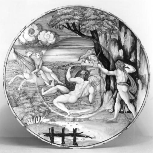 Keywords: Nanni di Bartolo - Plate with Hercules, Nessus and Deianira - Walters 481497.jpg This plate with a sunk center depicts Hercules Nessus and Deianira from an engraving by G J Caraglio after Il Rosso It is painted in blue turquoise-blue copper-green yellow ochre tan brown black and opaque white At the left Nessus holding a floating scarf gallops across the water with Deianira on his back In the center seen partly from the back a river-god who is holding a large vase with his left arm lies on the water near the shore At the right Hercules advances bending his bow There is a landscape background with open water The back is white stained with green and ornamented with three concentric yellow circles and two raised circles at the rim In the center in blue is written D e r c o l l e between 1525 1535 Renaissance earthenware with tin glaze maiolica cm 4 29 6 accession number 48 1497 39180 Henry Walters city Baltimore Walters Art Museum Henry Walters Acquired by Henry Walters 1908 Inscription On back center in blue D e r c o l l e place of origin Urbino Italy Walters Art Museum license Italian Renaissance maiolica in the Walters Art Museum Nanni di Bartolo Media contributed by the Walters Art Museum needs category review Media contributed by the Walters Art Museum needs artist review Urbino maiolica |
