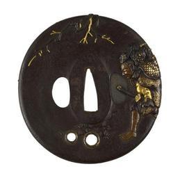 | Keywords: Nara Toshinaga I - Tsuba with Ă”mori Hikohichi Carrying a Demon Across a Stream - Walters 51307.jpg  The main figure on this tsuba is Ômori Hikohichi a 14th-century warrior He is most often depicted in art as he is here with a female demon on his back Hikohiki is said to have offered to carry a beautiful woman across a stream While crossing the stream he saw her reflection as a demon in the water In some versions of the story he kills her while in others she runs away When the story was adapted for use in theatrical dramas the woman was portrayed as the daughter of Kusunoki no Masahige who erroneously thought Hikohichi was responsible for her father's death The daughter was not actually a demon but wore a mask to frighten Hikohichi On the tsuba Hikohichi and the female demon are shown on the right side Their bodies wrap around the edge and can be seen on the back The two holes on the bottom of the tsuba were used for cords attached to the sword handle between 1667 1736 Edo iron gold silver copper shakudo cm 9 1 8 82 0 55 accession number 51 307 37045 Henry Walters Baltimore date and mode of acquisition unknown Walters Art Museum Henry Walters Acquired by Henry Walters Signature Toshinaga kao place of origin Edo present-day Tokyo Japan Walters Art Museum license Tsuba in the Walters Art Museum Nara Toshinaga I Media contributed by the Walters Art Museum needs category review |