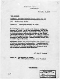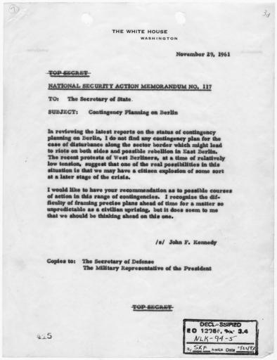 Keywords: National Security Action Memorandum No. 117 Contingency Planning on Berlin - NARA - 193510.jpg Scope and content Memorandum for Secretary of State concerning contingency planning on Berlin General notes 193510 Local identifier President 1961-1963 Kennedy Office of the Special Assistant to the President for National Security Affairs 01/20/1961 - 11/22/1963 NARA-Author Kennedy John F John Fitzgerald 1917-1963 Author 1331563 <br /> John F Kennedy Library NLJFK Columbia Point Boston MA 02125-3398 1961-11-29 Record group Collection JFK-NSF Papers of President Kennedy National Security Files 01/20/1961 - 11/22/1963 Record group ARC 1164 National Security Files Meetings and Memoranda compiled 1961 - 1963 Series ARC 193354 File unit National Security Files Meetings and Memoranda National Security Action Memoranda 02/03/1961 - 11/13/1963 File unit ARC 193400 Variant control numbers NAIL Control Number NLK-NSF-MM-NSAM-10EEET Other versions <gallery> File National_Security_Action_Memorandum_No _117_Contingency_Planning_on_Berlin_-_NARA_-_193510 tif tif File National_Security_Action_Memorandum_No _117_Contingency_Planning_on_Berlin_-_NARA_-_193510 jpg jpg </gallery> NARA-cooperation PD-USGov Check categories-NARA 2011 September 19 Presidential Decision Directives Kennedy |