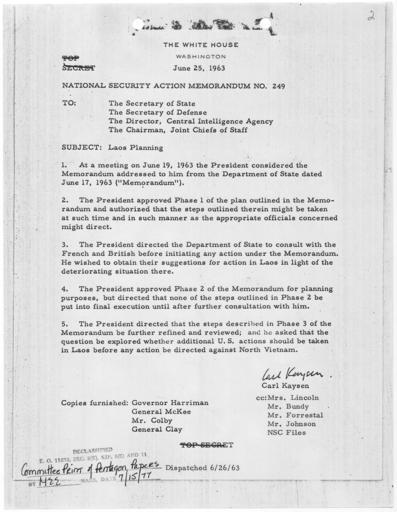Keywords: National Security Action Memorandum No. 249 Laos Planning - NARA - 193623.jpg Scope and content Memorandum for Secretary of State and others on the President's approval of plans concerning Laos General notes 193623 Local identifier President 1961-1963 Kennedy Office of the Special Assistant to the President for National Security Affairs 01/20/1961 - 11/22/1963 NARA-Author Kaysen Carl 1920- Author 1133982 <br /> John F Kennedy Library NLJFK Columbia Point Boston MA 02125-3398 1963-06-25 Record group Collection JFK-NSF Papers of President Kennedy National Security Files 01/20/1961 - 11/22/1963 Record group ARC 1164 National Security Files Meetings and Memoranda compiled 1961 - 1963 Series ARC 193354 File unit National Security Files Meetings and Memoranda National Security Action Memoranda 02/03/1961 - 11/13/1963 File unit ARC 193400 Variant control numbers NAIL Control Number NLK-NSF-MM-NSAM-10IIIQ Other versions <gallery> File National_Security_Action_Memorandum_No _249_Laos_Planning_-_NARA_-_193623 tif tif File National_Security_Action_Memorandum_No _249_Laos_Planning_-_NARA_-_193623 jpg jpg </gallery> NARA-cooperation PD-USGov Check categories-NARA 2011 September 19 Presidential Decision Directives Kennedy |
