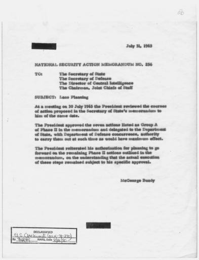 Keywords: National Security Action Memorandum No. 256 Laos planning - NARA - 193630.jpg Scope and content Memorandum for Secretary of State and others concerning the President's approval of courses of action regarding Laos General notes 193630 Local identifier President 1961-1963 Kennedy Office of the Special Assistant to the President for National Security Affairs 01/20/1961 - 11/22/1963 NARA-Author Bundy McGeorge 1919-1996 Author 1128212 <br /> John F Kennedy Library NLJFK Columbia Point Boston MA 02125-3398 1963-07-31 Record group Collection JFK-NSF Papers of President Kennedy National Security Files 01/20/1961 - 11/22/1963 Record group ARC 1164 National Security Files Meetings and Memoranda compiled 1961 - 1963 Series ARC 193354 File unit National Security Files Meetings and Memoranda National Security Action Memoranda 02/03/1961 - 11/13/1963 File unit ARC 193400 Variant control numbers NAIL Control Number NLK-NSF-MM-NSAM-10IIIX Other versions <gallery> File National_Security_Action_Memorandum_No _256_Laos_planning_-_NARA_-_193630 tif tif File National_Security_Action_Memorandum_No _256_Laos_planning_-_NARA_-_193630 jpg jpg </gallery> NARA-cooperation PD-USGov Presidential Decision Directives Kennedy McGeorge Bundy July 1963 in the United States Relations of Laos and the United States |