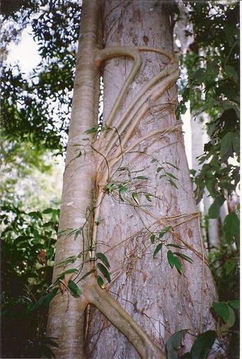 Keywords: Native Elm & Strangler - Richmond River.jpg en Strangler Fig probably F macrophylla and Wombat Berry vine on Native Elm Richmond River near Kyogle Australia Own Poyt448 Peter Woodard 1998-04 ok Strangler figs