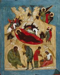 | Keywords: Nativity, poss. Moscow school (16th c., Hermitage).jpg Икона 'Рождество Х истово' Россия XVI в Икона Рождество Х истово написанная в XVI в входила в так называемый п аздничный яд иконостаса включающий иконы с изоб ажением сцен из жизни Х иста и Бого одицы Иконог афия сюжета Рождество Х истово сложилась ко вто ой половине XVI в а этой иконе лаконично изоб ажено несколько сцен описанных в Евангелии В цент е композиции п едставлено Рождество Х истово по свету путеводной звезды нап авляются т и всадника - восточных ца я волхва ; ангел пе едает весть о ождении Х иста пастухам Внизу показаны Иосиф и ста ик в зве иной шку е а также сцена омовения ладенца В живописной мане е можно п оследить че ты п исущие аботам Анд ея Рублева начало XV в осковский масте об атился к наследию этого великого д евне усского художника спустя более 100 лет после его сме ти что было ха акте ным для всей московской школы Отличительной че той иконы является едко вст ечаемый в усской иконописи голубой фон Школа осковская азвание Икона 'Рождество Х истово' есто создания Россия В емя создания XVI в Техника де ево паволока левкас темпе а позолота Разме ы 56x44 5 см Поступление Поступил в 1955 г П иоб етен у частного лица Инвента ный номе ЭРИ-196 http //hermitagemuseum org/wps/portal/hermitage/digital-collection/01 20paintings/568579/ ut/p/a1/lVHLboMwEPwVeuDornkZOCISVYpEaamqYF-QeYQ4AUPAadq_r5F6aA9pmz3tSrOzM7PAIAcm-ZtouRKD5N0yM1KkUUQsJ8abNPZWOEqzJy-LHx-w5cIWGLBOtkCn89JWUo1qD_TIezEX09nEl2E6zsawM_ikTIyte2PkQioh29nEHgk8P1wWx0rUQGvbcXnl2qjkoY_coKkRt30flQRbZVOSmoSVFkW1KHylIvwvzb8zUH3Cv8ZBEhteFo5tnBTPr-tMo79FcIOTzV9StVV7SuKk1bRc7ZGQuwHyHyFC_hWixorD6cQi_YVBquZdQX7bG8a-D5we5RhxGjhed_i43H0CdCEcyg /dl5/d5/L2dBISEvZ0FBIS9nQSEh/ lng ru 16th c 16 Icons of Nativity in Russia Files uploaded by Shakko from various sources Icons in Hermitage PD-old |