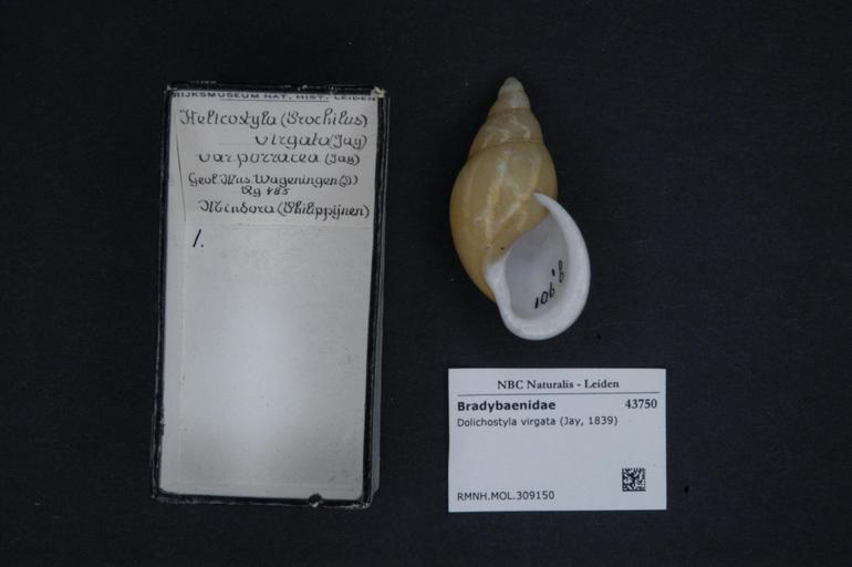 | Keywords: Naturalis Biodiversity Center - RMNH.MOL.309150 - Dolichostyla virgata (Jay, 1839) - Bradybaenidae - Mollusc shell.jpeg artwork Dimensions artwork Document type Bradybaenidae Dolichostyla Individual count Infraspecific epithet Infraspecific rank Institution Naturalis Kind of unit artwork Kind of unit specimen shell Life stage Medium artwork Nomenclatural code Source institute Rijksmuseum van Natuurlijke Historie Leiden Scale the width of the text on the species/QR-code label is 38 mm Occurrence ID page Other fields Other versions artwork Permission license Naturalis donation CC-0 Mollusca Publication location Scientific name Dolichostyla virgata Jay 1839 Scientific name authorship Jay 1839 Source url http //bioportal naturalis nl Specific epithet virgata State or province Subject keywords artwork Subject keywords publication Title artwork Title publication Type status Uploaded with GWToolset Naturalis_Biodiversity_Center_-_RMNH MOL 309150_-_Dolichostyla_virgata_ Jay _1839 _-_Bradybaenidae_-_Mollusc_shell http //medialib naturalis nl/file/id/RMNH MOL 309150/format/large Media donated by Naturalis Biodiversity Center Molluscs at Naturalis from the Rijksmuseum van Natuurlijke Historie Dolichostyla virgata Dolichostyla |