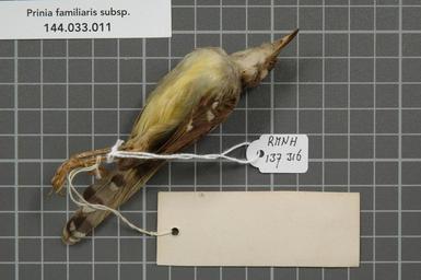 | Keywords: Naturalis Biodiversity Center - RMNH.AVES.137316 2 - Prinia familiaris subsp. - Sylviidae - bird skin specimen.jpeg artwork Dimensions artwork Document type Sylviidae Prinia Individual count 1 Infraspecific epithet subsp Infraspecific rank Institution Naturalis Kind of unit artwork Kind of unit specimen skin Life stage Medium artwork Nomenclatural code Occurrence ID page Other fields Other versions artwork Permission license Naturalis donation CC-0 Publication location Scientific name Prinia familiaris subsp Scientific name authorship Source url http //bioportal naturalis nl Specific epithet familiaris State or province Subject keywords artwork Subject keywords publication Title artwork Title publication Type status Uploaded with GWToolset Naturalis_Biodiversity_Center_-_RMNH AVES 137316_2_-_Prinia_familiaris_subsp _-_Sylviidae_-_bird_skin_specimen http //medialib naturalis nl/file/id/RMNH AVES 137316_2/format/large Media donated by Naturalis Biodiversity Center Songbird specimens at Naturalis Biodiversity Center Prinia familiaris Prinia |