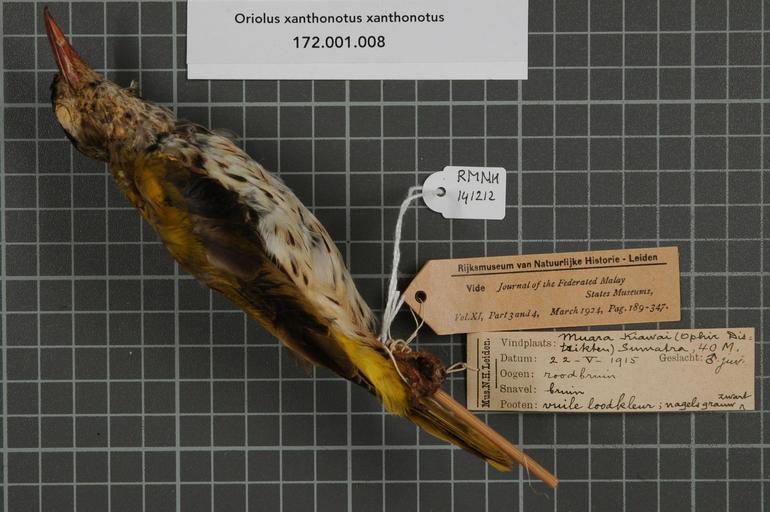 Keywords: Naturalis Biodiversity Center - RMNH.AVES.141212 1 - Oriolus xanthonotus xanthonotus Horsfield, 1821 - Oriolidae - bird skin specimen.jpeg artwork Dimensions artwork Document type Oriolidae Oriolus Individual count 1 Infraspecific epithet xanthonotus Infraspecific rank Institution Naturalis Kind of unit artwork Kind of unit specimen skin Life stage juvenile Indonesia Sumatra Ophir Distrikten Muara Kiawai Medium artwork Nomenclatural code Occurrence ID page Other fields Other versions artwork Permission license Naturalis donation CC-0 Publication location Scientific name Oriolus xanthonotus xanthonotus Horsfield 1821 Scientific name authorship Horsfield 1821 male Source url http //bioportal naturalis nl Specific epithet xanthonotus State or province Sumatra Ophir Distrikten Subject keywords artwork Subject keywords publication Title artwork Title publication Type status Uploaded with GWToolset Naturalis_Biodiversity_Center_-_RMNH AVES 141212_1_-_Oriolus_xanthonotus_xanthonotus_Horsfield _1821_-_Oriolidae_-_bird_skin_specimen http //medialib naturalis nl/file/id/RMNH AVES 141212_1/format/large Media donated by Naturalis Biodiversity Center Songbird specimens at Naturalis Biodiversity Center Oriolus xanthonotus Oriolus |