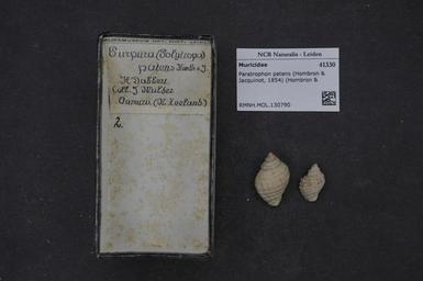 Keywords: Naturalis Biodiversity Center - RMNH.MOL.130790 - Paratrophon patens (Hombron & Jacquinot, 1854) - Muricidae - Mollusc shell.jpeg artwork Dimensions artwork Document type Muricidae subfamily Trophoninae Paratrophon Individual count Infraspecific epithet Infraspecific rank Institution Naturalis Kind of unit artwork Kind of unit specimen shell Life stage Medium artwork Nomenclatural code Source institute Leiden Scale the width of the text on the species/QR-code label is 38 mm Occurrence ID page Neogastropoda Other fields Other versions artwork Permission license Naturalis donation CC-0 Mollusca Publication location Scientific name Paratrophon patens Hombron Jacquinot 1854 Scientific name authorship Hombron Jacquinot 1854 Source url http //bioportal naturalis nl Specific epithet patens State or province Subject keywords artwork Subject keywords publication Title artwork Title publication Type status Uploaded with GWToolset Naturalis_Biodiversity_Center_-_RMNH MOL 130790_-_Paratrophon_patens_ Hombron_ _Jacquinot _1854 _-_Muricidae_-_Mollusc_shell http //medialib naturalis nl/file/id/RMNH MOL 130790/format/large Molluscs at Naturalis from the Rijksmuseum van Natuurlijke Historie Media donated by Naturalis Biodiversity Center Paratrophon Paratrophon patens |