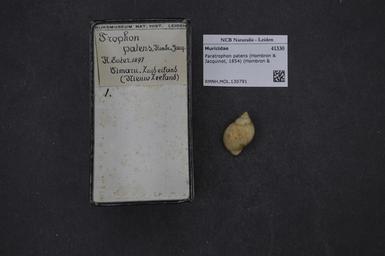 Keywords: Naturalis Biodiversity Center - RMNH.MOL.130791 - Paratrophon patens (Hombron & Jacquinot, 1854) - Muricidae - Mollusc shell.jpeg artwork Dimensions artwork Document type Muricidae subfamily Trophoninae Paratrophon Individual count Infraspecific epithet Infraspecific rank Institution Naturalis Kind of unit artwork Kind of unit specimen shell Life stage Medium artwork Nomenclatural code Source institute Leiden Scale the width of the text on the species/QR-code label is 38 mm Occurrence ID page Neogastropoda Other fields Other versions artwork Permission license Naturalis donation CC-0 Mollusca Publication location Scientific name Paratrophon patens Hombron Jacquinot 1854 Scientific name authorship Hombron Jacquinot 1854 Source url http //bioportal naturalis nl Specific epithet patens State or province Subject keywords artwork Subject keywords publication Title artwork Title publication Type status Uploaded with GWToolset Naturalis_Biodiversity_Center_-_RMNH MOL 130791_-_Paratrophon_patens_ Hombron_ _Jacquinot _1854 _-_Muricidae_-_Mollusc_shell http //medialib naturalis nl/file/id/RMNH MOL 130791/format/large Molluscs at Naturalis from the Rijksmuseum van Natuurlijke Historie Media donated by Naturalis Biodiversity Center Paratrophon Paratrophon patens |