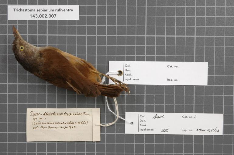 | Keywords: Naturalis Biodiversity Center - RMNH.AVES.147063 2 - Trichastoma sepiarium rufiventre (Salvadori, 1874) - Timaliidae - bird skin specimen.jpeg artwork Dimensions artwork Document type Timaliidae Trichastoma Individual count 1 Infraspecific epithet rufiventre Infraspecific rank Institution Naturalis Kind of unit artwork Kind of unit specimen skin Life stage Indonesia Borneo Pontianak Medium artwork Nomenclatural code Check type ADDITIONAL identification info hypoides Temm MS name concreta Bp nomen nudum R Dekker 20 VI 2001 Sex remark On original label male lab Occurrence ID page Other fields Other versions artwork Permission license Naturalis donation CC-0 Publication location Scientific name Trichastoma sepiarium rufiventre Salvadori 1874 Scientific name authorship Salvadori 1874 male Source url http //bioportal naturalis nl Specific epithet sepiarium State or province Subject keywords artwork Subject keywords publication Title artwork Title publication Type status Uploaded with GWToolset Naturalis_Biodiversity_Center_-_RMNH AVES 147063_2_-_Trichastoma_sepiarium_rufiventre_ Salvadori _1874 _-_Timaliidae_-_bird_skin_specimen http //medialib naturalis nl/file/id/RMNH AVES 147063_2/format/large Media donated by Naturalis Biodiversity Center Songbird specimens at Naturalis Biodiversity Center Trichastoma Trichastoma sepiarium |