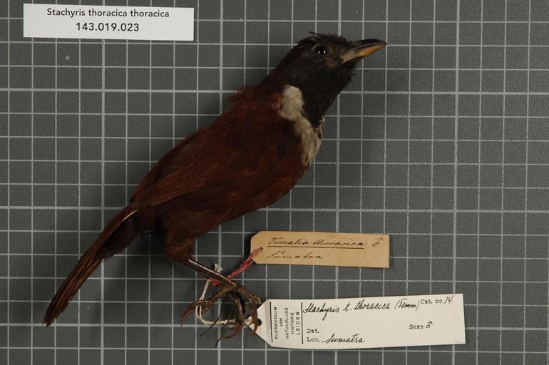 | Keywords: Naturalis Biodiversity Center - RMNH.AVES.147559 1 - Stachyris thoracica thoracica (Temminck, 1821) - Timaliidae - bird skin specimen.jpeg artwork Dimensions artwork Document type Timaliidae Stachyris Individual count 1 Infraspecific epithet thoracica Infraspecific rank Institution Naturalis Kind of unit artwork Kind of unit specimen skin Life stage Indonesia Sumatra Medium artwork Nomenclatural code Country remark printed on original label Asien Occurrence ID page Other fields Other versions artwork Permission license Naturalis donation CC-0 Publication location Scientific name Stachyris thoracica thoracica Temminck 1821 Scientific name authorship Temminck 1821 male Source url http //bioportal naturalis nl Specific epithet thoracica State or province Subject keywords artwork Subject keywords publication Title artwork Title publication Type status Uploaded with GWToolset Naturalis_Biodiversity_Center_-_RMNH AVES 147559_1_-_Stachyris_thoracica_thoracica_ Temminck _1821 _-_Timaliidae_-_bird_skin_specimen http //medialib naturalis nl/file/id/RMNH AVES 147559_1/format/large Media donated by Naturalis Biodiversity Center Songbird specimens at Naturalis Biodiversity Center Stachyris Stachyris thoracica |