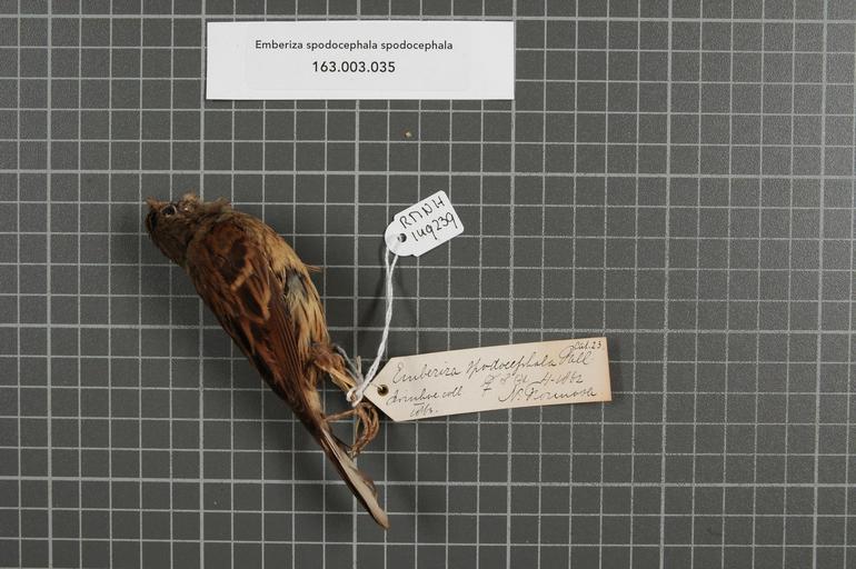 | Keywords: Naturalis Biodiversity Center - RMNH.AVES.149239 1 - Emberiza spodocephala spodocephala Pallas, 1776 - Emberizidae - bird skin specimen.jpeg artwork Dimensions artwork Document type Emberizidae Emberiza Individual count 1 Infraspecific epithet spodocephala Infraspecific rank Institution Naturalis Kind of unit artwork Kind of unit specimen skin Life stage N Formosa Medium artwork Nomenclatural code Sex remark on label female whipped out male GK Occurrence ID page Other fields Other versions artwork Permission license Naturalis donation CC-0 Publication location Scientific name Emberiza spodocephala spodocephala Pallas 1776 Scientific name authorship Pallas 1776 female Source url http //bioportal naturalis nl Specific epithet spodocephala State or province N Formosa Subject keywords artwork Subject keywords publication Title artwork Title publication Type status Uploaded with GWToolset Naturalis_Biodiversity_Center_-_RMNH AVES 149239_1_-_Emberiza_spodocephala_spodocephala_Pallas _1776_-_Emberizidae_-_bird_skin_specimen http //medialib naturalis nl/file/id/RMNH AVES 149239_1/format/large Media donated by Naturalis Biodiversity Center Songbird specimens at Naturalis Biodiversity Center Emberiza Emberiza spodocephala |