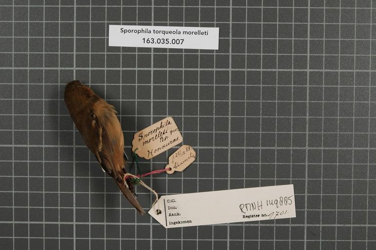 Keywords: Naturalis Biodiversity Center - RMNH.AVES.149885 1 - Presrophila torqueola morelleti (Bonaparte, 1851) - Emberizidae - bird skin specimen.jpeg artwork Dimensions artwork Document type Emberizidae Sporophila Individual count 1 Infraspecific epithet morelleti Infraspecific rank Institution Naturalis Kind of unit artwork Kind of unit specimen skin Life stage juvenile Honduras Chamelicon Medium artwork Nomenclatural code Occurrence ID page Other fields Other versions artwork Permission license Naturalis donation CC-0 Publication location Scientific name Presrophila torqueola morelleti Bonaparte 1851 Scientific name authorship Bonaparte 1851 male Source url http //bioportal naturalis nl Specific epithet torqueola State or province Subject keywords artwork Subject keywords publication Title artwork Title publication Type status Uploaded with GWToolset Naturalis_Biodiversity_Center_-_RMNH AVES 149885_1_-_Presrophila_torqueola_morelleti_ Bonaparte _1851 _-_Emberizidae_-_bird_skin_specimen http //medialib naturalis nl/file/id/RMNH AVES 149885_1/format/large Media donated by Naturalis Biodiversity Center Songbird specimens at Naturalis Biodiversity Center Sporophila Sporophila torqueola
