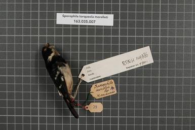Keywords: Naturalis Biodiversity Center - RMNH.AVES.149886 1 - Presrophila torqueola morelleti (Bonaparte, 1851) - Emberizidae - bird skin specimen.jpeg artwork Dimensions artwork Document type Emberizidae Sporophila Individual count 1 Infraspecific epithet morelleti Infraspecific rank Institution Naturalis Kind of unit artwork Kind of unit specimen skin Life stage juvenile Honduras Medium artwork Nomenclatural code Age remark on label juv whipped out Occurrence ID page Other fields Other versions artwork Permission license Naturalis donation CC-0 Publication location Scientific name Presrophila torqueola morelleti Bonaparte 1851 Scientific name authorship Bonaparte 1851 Source url http //bioportal naturalis nl Specific epithet torqueola State or province Subject keywords artwork Subject keywords publication Title artwork Title publication Type status Uploaded with GWToolset Naturalis_Biodiversity_Center_-_RMNH AVES 149886_1_-_Presrophila_torqueola_morelleti_ Bonaparte _1851 _-_Emberizidae_-_bird_skin_specimen http //medialib naturalis nl/file/id/RMNH AVES 149886_1/format/large Media donated by Naturalis Biodiversity Center Songbird specimens at Naturalis Biodiversity Center Sporophila Sporophila torqueola