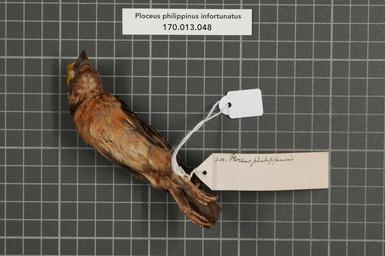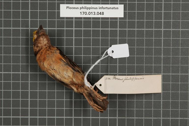 | Keywords: Naturalis Biodiversity Center - RMNH.AVES.151409 2 - Ploceus philippinus infortunatus Hartert, 1902 - Ploceidae - bird skin specimen.jpeg artwork Dimensions artwork Document type Ploceidae Ploceus Individual count 1 Infraspecific epithet infortunatus Infraspecific rank Institution Naturalis Kind of unit artwork Kind of unit specimen skin Life stage Indonesia West Sumatra Medium artwork Nomenclatural code Occurrence ID page Other fields Other versions artwork Permission license Naturalis donation CC-0 Publication location Scientific name Ploceus philippinus infortunatus Hartert 1902 Scientific name authorship Hartert 1902 Source url http //bioportal naturalis nl Specific epithet philippinus State or province West Sumatra Subject keywords artwork Subject keywords publication Title artwork Title publication Type status Uploaded with GWToolset Naturalis_Biodiversity_Center_-_RMNH AVES 151409_2_-_Ploceus_philippinus_infortunatus_Hartert _1902_-_Ploceidae_-_bird_skin_specimen http //medialib naturalis nl/file/id/RMNH AVES 151409_2/format/large Media donated by Naturalis Biodiversity Center Songbird specimens at Naturalis Biodiversity Center Ploceus philippinus Ploceus |