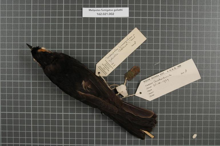 Keywords: Naturalis Biodiversity Center - RMNH.AVES.19141 1 - Melipotes fumigatus goliathi Rothschild and Hartert, 1911 - Meliphagidae - bird skin specimen.jpeg artwork Dimensions artwork Document type Meliphagidae Melipotes Individual count 1 Infraspecific epithet goliathi Infraspecific rank Institution Naturalis Kind of unit artwork Kind of unit specimen skin Life stage Araboebivak Medium artwork Nomenclatural code Occurrence ID page Other fields Other versions artwork Permission license Naturalis donation CC-0 Publication location Scientific name Melipotes fumigatus goliathi Rothschild and Hartert 1911 Scientific name authorship Rothschild and Hartert 1911 male Source url http //bioportal naturalis nl Specific epithet fumigatus State or province Subject keywords artwork Subject keywords publication Title artwork Title publication Type status Uploaded with GWToolset Naturalis_Biodiversity_Center_-_RMNH AVES 19141_1_-_Melipotes_fumigatus_goliathi_Rothschild_and_Hartert _1911_-_Meliphagidae_-_bird_skin_specimen http //medialib naturalis nl/file/id/RMNH AVES 19141_1/format/large Media donated by Naturalis Biodiversity Center Songbird specimens at Naturalis Biodiversity Center Melipotes fumigatus Melipotes |