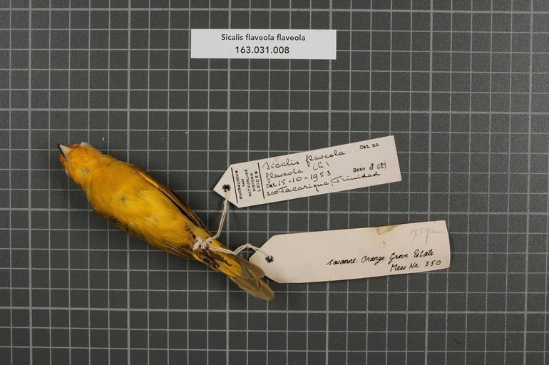 | Keywords: Naturalis Biodiversity Center - RMNH.AVES.21301 2 - Sicalis flaveola flaveola (Linnaeus, 1766) - Emberizidae - bird skin specimen.jpeg artwork Dimensions artwork Document type Emberizidae Sicalis Individual count 1 Infraspecific epithet flaveola Infraspecific rank Institution Naturalis Kind of unit artwork Kind of unit specimen skin Life stage Trinidad Tacarigua Savanna Orange Grove Estate Medium artwork Nomenclatural code Sex remark on label Mees male on other side label f male wiped out Occurrence ID page Other fields Other versions artwork Permission license Naturalis donation CC-0 Publication location Scientific name Sicalis flaveola flaveola Linnaeus 1766 Scientific name authorship Linnaeus 1766 male Source url http //bioportal naturalis nl Specific epithet flaveola State or province Tacarigua Subject keywords artwork Subject keywords publication Title artwork Title publication Type status Uploaded with GWToolset Naturalis_Biodiversity_Center_-_RMNH AVES 21301_2_-_Sicalis_flaveola_flaveola_ Linnaeus _1766 _-_Emberizidae_-_bird_skin_specimen http //medialib naturalis nl/file/id/RMNH AVES 21301_2/format/large Media donated by Naturalis Biodiversity Center Songbird specimens at Naturalis Biodiversity Center Sicalis flaveola Sicalis |