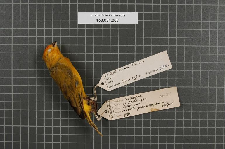| Keywords: Naturalis Biodiversity Center - RMNH.AVES.21301 1 - Sicalis flaveola flaveola (Linnaeus, 1766) - Emberizidae - bird skin specimen.jpeg artwork Dimensions artwork Document type Emberizidae Sicalis Individual count 1 Infraspecific epithet flaveola Infraspecific rank Institution Naturalis Kind of unit artwork Kind of unit specimen skin Life stage Trinidad Tacarigua Savanna Orange Grove Estate Medium artwork Nomenclatural code Sex remark on label Mees male on other side label f male wiped out Occurrence ID page Other fields Other versions artwork Permission license Naturalis donation CC-0 Publication location Scientific name Sicalis flaveola flaveola Linnaeus 1766 Scientific name authorship Linnaeus 1766 male Source url http //bioportal naturalis nl Specific epithet flaveola State or province Tacarigua Subject keywords artwork Subject keywords publication Title artwork Title publication Type status Uploaded with GWToolset Naturalis_Biodiversity_Center_-_RMNH AVES 21301_1_-_Sicalis_flaveola_flaveola_ Linnaeus _1766 _-_Emberizidae_-_bird_skin_specimen http //medialib naturalis nl/file/id/RMNH AVES 21301_1/format/large Media donated by Naturalis Biodiversity Center Songbird specimens at Naturalis Biodiversity Center Sicalis flaveola Sicalis |