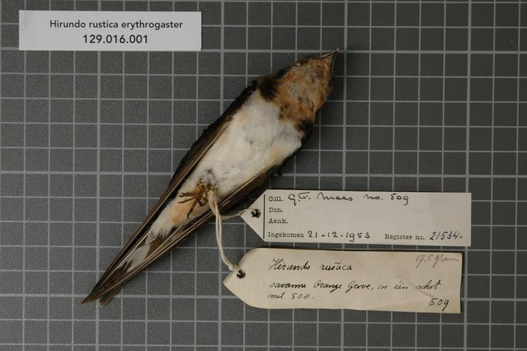 | Keywords: Naturalis Biodiversity Center - RMNH.AVES.21534 2 - Hirundo rustica erythrogaster Boddaert, 1783 - Hirundinidae - bird skin specimen.jpeg artwork Dimensions artwork Document type Hirundinidae Hirundo Individual count 1 Infraspecific epithet erythrogaster Infraspecific rank Institution Naturalis Kind of unit artwork Kind of unit specimen skin Life stage Trinidad Tacarigua Orange Grove Estate Medium artwork Nomenclatural code Sex remark Occurrence ID page Other fields Other versions artwork Permission license Naturalis donation CC-0 Publication location Scientific name Hirundo rustica erythrogaster Boddaert 1783 Scientific name authorship Boddaert 1783 Source url http //bioportal naturalis nl Specific epithet rustica State or province Subject keywords artwork Subject keywords publication Title artwork Title publication Type status Uploaded with GWToolset Naturalis_Biodiversity_Center_-_RMNH AVES 21534_2_-_Hirundo_rustica_erythrogaster_Boddaert _1783_-_Hirundinidae_-_bird_skin_specimen http //medialib naturalis nl/file/id/RMNH AVES 21534_2/format/large Media donated by Naturalis Biodiversity Center Songbird specimens at Naturalis Biodiversity Center Hirundo rustica Hirundo |