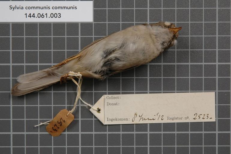 | Keywords: Naturalis Biodiversity Center - RMNH.AVES.2523 2 - Sylvia communis communis Latham, 1787 - Sylviidae - bird skin specimen.jpeg artwork Dimensions artwork Document type Sylviidae Sylvia Individual count 1 Infraspecific epithet communis Infraspecific rank Institution Naturalis Kind of unit artwork Kind of unit specimen skin Life stage N B Tongelre Medium artwork Nomenclatural code Occurrence ID page Other fields Other versions artwork Permission license Naturalis donation CC-0 Publication location Scientific name Sylvia communis communis Latham 1787 Scientific name authorship Latham 1787 female Source url http //bioportal naturalis nl Specific epithet communis State or province N B Subject keywords artwork Subject keywords publication Title artwork Title publication Type status Uploaded with GWToolset Naturalis_Biodiversity_Center_-_RMNH AVES 2523_2_-_Sylvia_communis_communis_Latham _1787_-_Sylviidae_-_bird_skin_specimen http //medialib naturalis nl/file/id/RMNH AVES 2523_2/format/large Media donated by Naturalis Biodiversity Center Songbird specimens at Naturalis Biodiversity Center Sylvia communis Sylvia |
