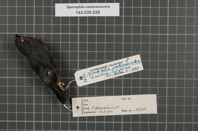 | Keywords: Naturalis Biodiversity Center - RMNH.AVES.28768 1 - Sporophila castaneiventris Cabanis, 1849 - Emberizidae - bird skin specimen.jpeg artwork Dimensions artwork Document type Emberizidae Sporophila Individual count 1 Infraspecific epithet Infraspecific rank Institution Naturalis Kind of unit artwork Kind of unit specimen skin Life stage Surinam Zanderij Medium artwork Nomenclatural code Occurrence ID page Other fields Other versions artwork Permission license Naturalis donation CC-0 Publication location Scientific name Sporophila castaneiventris Cabanis 1849 Scientific name authorship Cabanis 1849 male Source url http //bioportal naturalis nl Specific epithet castaneiventris State or province Subject keywords artwork Subject keywords publication Title artwork Title publication Type status Uploaded with GWToolset Naturalis_Biodiversity_Center_-_RMNH AVES 28768_1_-_Sporophila_castaneiventris_Cabanis _1849_-_Emberizidae_-_bird_skin_specimen http //medialib naturalis nl/file/id/RMNH AVES 28768_1/format/large Media donated by Naturalis Biodiversity Center Songbird specimens at Naturalis Biodiversity Center Sporophila castaneiventris Sporophila |