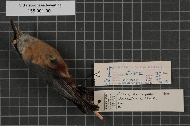 Keywords: Naturalis Biodiversity Center - RMNH.AVES.29161 1 - Sitta europaea levantina Hartert, 1905 - Sittidae - bird skin specimen.jpeg artwork Dimensions artwork Document type Sittidae Sitta Individual count 1 Infraspecific epithet levantina Infraspecific rank Institution Naturalis Kind of unit artwork Kind of unit specimen skin Life stage Türkei Burdur Medium artwork Nomenclatural code Bodily condition Fett I ADDITIONAL info see drawing dot in circle Country remark on label Tür Occurrence ID page Other fields Other versions artwork Permission license Naturalis donation CC-0 Publication location Scientific name Sitta europaea levantina Hartert 1905 Scientific name authorship Hartert 1905 male Source url http //bioportal naturalis nl Specific epithet europaea State or province Burdur Subject keywords artwork Subject keywords publication Title artwork Title publication Type status Uploaded with GWToolset Naturalis_Biodiversity_Center_-_RMNH AVES 29161_1_-_Sitta_europaea_levantina_Hartert _1905_-_Sittidae_-_bird_skin_specimen http //medialib naturalis nl/file/id/RMNH AVES 29161_1/format/large Media donated by Naturalis Biodiversity Center Songbird specimens at Naturalis Biodiversity Center Sitta europaea Sitta |