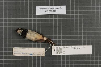 | Keywords: Naturalis Biodiversity Center - RMNH.AVES.35078 2 - Sporophila torqueola torqueola (Bonaparte, 1851) - Emberizidae - bird skin specimen.jpeg artwork Dimensions artwork Document type Emberizidae Sporophila Individual count 1 Infraspecific epithet torqueola Infraspecific rank Institution Naturalis Kind of unit artwork Kind of unit specimen skin Life stage Oaxaca Loma Bonita Rancho Las Vegas Medium artwork Nomenclatural code Bodily condition Fett II Occurrence ID page Other fields Other versions artwork Permission license Naturalis donation CC-0 Publication location Scientific name Sporophila torqueola torqueola Bonaparte 1851 Scientific name authorship Bonaparte 1851 male Source url http //bioportal naturalis nl Specific epithet torqueola State or province Oaxaca Subject keywords artwork Subject keywords publication Title artwork Title publication Type status Uploaded with GWToolset Naturalis_Biodiversity_Center_-_RMNH AVES 35078_2_-_Sporophila_torqueola_torqueola_ Bonaparte _1851 _-_Emberizidae_-_bird_skin_specimen http //medialib naturalis nl/file/id/RMNH AVES 35078_2/format/large Media donated by Naturalis Biodiversity Center Songbird specimens at Naturalis Biodiversity Center Sporophila torqueola Sporophila |