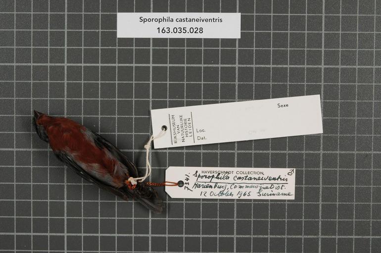 View Original:Naturalis Biodiversity Center - RMNH.AVES.38065 2 - Sporophila castaneiventris Cabanis, 1849 - Emberizidae - bird skin specimen.jpeg (1920x1277)