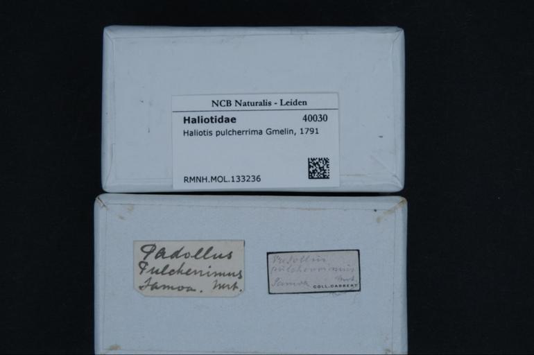 | Keywords: Naturalis Biodiversity Center - RMNH.MOL.133236 1 - Haliotis pulcherrima Gmelin, 1791 - Haliotidae - Mollusc shell.jpeg  artwork Dimensions artwork Document type Haliotidae Haliotis Individual count Infraspecific epithet Infraspecific rank Institution Naturalis Kind of unit artwork Kind of unit specimen shell Life stage Medium artwork Nomenclatural code Source institute Leiden Scale the width of the text on the species/QR-code label is 38 mm Occurrence ID page Other fields Other versions artwork Permission license Naturalis donation CC-0 Mollusca Publication location Scientific name Haliotis pulcherrima Gmelin 1791 Scientific name authorship Gmelin 1791 Source url http //bioportal naturalis nl Specific epithet pulcherrima State or province Subject keywords artwork Subject keywords publication Title artwork Title publication Type status Uploaded with GWToolset Naturalis_Biodiversity_Center_-_RMNH MOL 133236_1_-_Haliotis_pulcherrima_Gmelin _1791_-_Haliotidae_-_Mollusc_shell http //medialib naturalis nl/file/id/RMNH MOL 133236_1/format/large Molluscs at Naturalis from the Rijksmuseum van Natuurlijke Historie Media donated by Naturalis Biodiversity Center Haliotis Haliotis pulcherrima |
