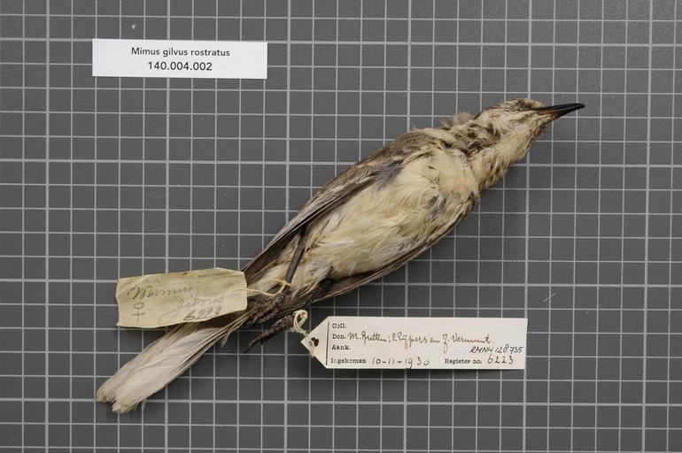 Keywords: Naturalis Biodiversity Center - RMNH.AVES.128735 2 - Mimus gilvus rostratus Ridgway, 1884 - Mimidae - bird skin specimen.jpeg artwork Dimensions artwork Document type Mimidae Mimus Individual count 1 Infraspecific epithet rostratus Infraspecific rank Institution Naturalis Kind of unit artwork Kind of unit specimen skin Life stage Medium artwork Nomenclatural code Region remark on field label Benedenwinsche-Eil Occurrence ID page Other fields Other versions artwork Permission license Naturalis donation CC-0 Publication location Scientific name Mimus gilvus rostratus Ridgway 1884 Scientific name authorship Ridgway 1884 female Source url http //bioportal naturalis nl Specific epithet gilvus State or province Aruba Subject keywords artwork Subject keywords publication Title artwork Title publication Type status Uploaded with GWToolset Naturalis_Biodiversity_Center_-_RMNH AVES 128735_2_-_Mimus_gilvus_rostratus_Ridgway _1884_-_Mimidae_-_bird_skin_specimen http //medialib naturalis nl/file/id/RMNH AVES 128735_2/format/large Media donated by Naturalis Biodiversity Center Songbird specimens at Naturalis Biodiversity Center Mimus gilvus museum specimens |