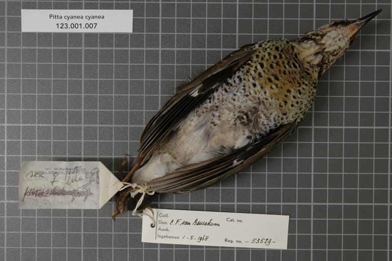 | Keywords: Naturalis Biodiversity Center - RMNH.AVES.53529 2 - Pitta cyanea cyanea Blyth, 1843 - Pittidae - bird skin specimen.jpeg  artwork Dimensions artwork Document type Pittidae Pitta Individual count 1 Infraspecific epithet cyanea Infraspecific rank Institution Naturalis Kind of unit artwork Kind of unit specimen skin Life stage Thailand Kanchanaburi Khao Yai near river Kwai Medium artwork Nomenclatural code Occurrence ID page Other fields Other versions artwork Permission license Naturalis donation CC-0 Publication location Scientific name Pitta cyanea cyanea Blyth 1843 Scientific name authorship Blyth 1843 female Source url http //bioportal naturalis nl Specific epithet cyanea State or province Kanchanaburi Subject keywords artwork Subject keywords publication Title artwork Title publication Type status Uploaded with GWToolset Naturalis_Biodiversity_Center_-_RMNH AVES 53529_2_-_Pitta_cyanea_cyanea_Blyth _1843_-_Pittidae_-_bird_skin_specimen http //medialib naturalis nl/file/id/RMNH AVES 53529_2/format/large Media donated by Naturalis Biodiversity Center Songbird specimens at Naturalis Biodiversity Center Pitta cyanea Pitta |