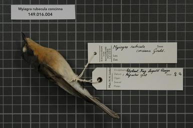 Keywords: Naturalis Biodiversity Center - RMNH.AVES.54705 1 - Myiagra rubecula concinna Gould, 1848 - Monarchidae - bird skin specimen.jpeg artwork Dimensions artwork Document type Monarchidae Myiagra Individual count 1 Infraspecific epithet concinna Infraspecific rank Institution Naturalis Kind of unit artwork Kind of unit specimen skin Life stage W Australiƫ King Leopold Range Elephant Medium artwork Nomenclatural code Occurrence ID page Other fields Other versions artwork Permission license Naturalis donation CC-0 Publication location Scientific name Myiagra rubecula concinna Gould 1848 Scientific name authorship Gould 1848 female Source url http //bioportal naturalis nl Specific epithet rubecula State or province W Australiƫ King Leopold Range Subject keywords artwork Subject keywords publication Title artwork Title publication Type status Uploaded with GWToolset Naturalis_Biodiversity_Center_-_RMNH AVES 54705_1_-_Myiagra_rubecula_concinna_Gould _1848_-_Monarchidae_-_bird_skin_specimen http //medialib naturalis nl/file/id/RMNH AVES 54705_1/format/large Media donated by Naturalis Biodiversity Center Songbird specimens at Naturalis Biodiversity Center Myiagra rubecula Myiagra |