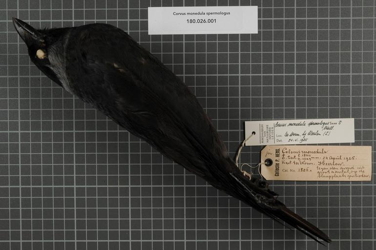 | Keywords: Naturalis Biodiversity Center - RMNH.AVES.56305 1 - Corvus monedula spermologus Vieillot, 1817 - Corvidae - bird skin specimen.jpeg artwork Dimensions artwork Document type Corvidae Corvus Individual count 1 Infraspecific epithet spermologus Infraspecific rank Institution Naturalis Kind of unit artwork Kind of unit specimen skin Life stage juvenile Netherlands Limburg Heerlen Kasteel ter Worm Medium artwork Nomenclatural code Bodily condition mAger Occurrence ID page Other fields Other versions artwork Permission license Naturalis donation CC-0 Publication location Scientific name Corvus monedula spermologus Vieillot 1817 Scientific name authorship Vieillot 1817 male Source url http //bioportal naturalis nl Specific epithet monedula State or province Limburg Subject keywords artwork Subject keywords publication Title artwork Title publication Type status Uploaded with GWToolset Naturalis_Biodiversity_Center_-_RMNH AVES 56305_1_-_Corvus_monedula_spermologus_Vieillot _1817_-_Corvidae_-_bird_skin_specimen http //medialib naturalis nl/file/id/RMNH AVES 56305_1/format/large Media donated by Naturalis Biodiversity Center Songbird specimens at Naturalis Biodiversity Center Coloeus monedula Corvus |