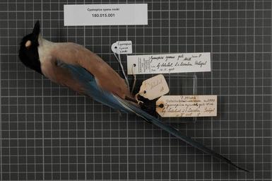 | Keywords: Naturalis Biodiversity Center - RMNH.AVES.56336 1 - Cyanopica cyana cooki Bonaparte, 1850 - Corvidae - bird skin specimen.jpeg  artwork Dimensions artwork Document type Corvidae Cyanopica Individual count 1 Infraspecific epithet cooki Infraspecific rank Institution Naturalis Kind of unit artwork Kind of unit specimen skin Life stage Portugal bij Setubal Z van Lissabon Medium artwork Nomenclatural code General remarks Subsp gili is niet bekend in Peters Occurrence ID page Other fields Other versions artwork Permission license Naturalis donation CC-0 Publication location Scientific name Cyanopica cyana cooki Bonaparte 1850 Scientific name authorship Bonaparte 1850 male Source url http //bioportal naturalis nl Specific epithet cyana State or province Subject keywords artwork Subject keywords publication Title artwork Title publication Type status Uploaded with GWToolset Naturalis_Biodiversity_Center_-_RMNH AVES 56336_1_-_Cyanopica_cyana_cooki_Bonaparte _1850_-_Corvidae_-_bird_skin_specimen http //medialib naturalis nl/file/id/RMNH AVES 56336_1/format/large Media donated by Naturalis Biodiversity Center Songbird specimens at Naturalis Biodiversity Center Cyanopica cyanus Cyanopica |