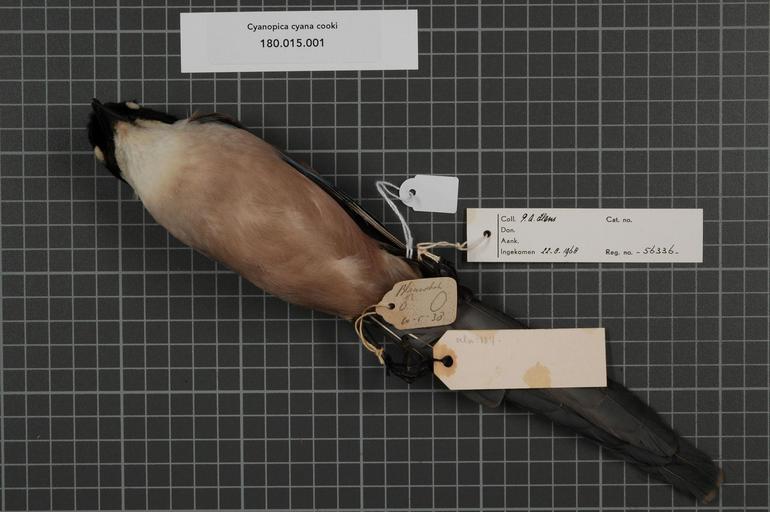 | Keywords: Naturalis Biodiversity Center - RMNH.AVES.56336 2 - Cyanopica cyana cooki Bonaparte, 1850 - Corvidae - bird skin specimen.jpeg  artwork Dimensions artwork Document type Corvidae Cyanopica Individual count 1 Infraspecific epithet cooki Infraspecific rank Institution Naturalis Kind of unit artwork Kind of unit specimen skin Life stage Portugal bij Setubal Z van Lissabon Medium artwork Nomenclatural code General remarks Subsp gili is niet bekend in Peters Occurrence ID page Other fields Other versions artwork Permission license Naturalis donation CC-0 Publication location Scientific name Cyanopica cyana cooki Bonaparte 1850 Scientific name authorship Bonaparte 1850 male Source url http //bioportal naturalis nl Specific epithet cyana State or province Subject keywords artwork Subject keywords publication Title artwork Title publication Type status Uploaded with GWToolset Naturalis_Biodiversity_Center_-_RMNH AVES 56336_2_-_Cyanopica_cyana_cooki_Bonaparte _1850_-_Corvidae_-_bird_skin_specimen http //medialib naturalis nl/file/id/RMNH AVES 56336_2/format/large Media donated by Naturalis Biodiversity Center Songbird specimens at Naturalis Biodiversity Center Cyanopica cyanus Cyanopica |