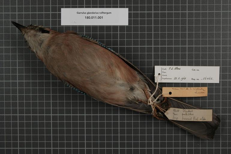 | Keywords: Naturalis Biodiversity Center - RMNH.AVES.56465 2 - Garrulus glandarius rufitergum Hartert, 1903 - Corvidae - bird skin specimen.jpeg artwork Dimensions artwork Document type Corvidae Garrulus Individual count 1 Infraspecific epithet rufitergum Infraspecific rank Institution Naturalis Kind of unit artwork Kind of unit specimen skin Life stage Engeland Yorks Yarm on Tees Medium artwork Nomenclatural code ADDITIONAL info remark last word unclear Occurrence ID page Other fields Other versions artwork Permission license Naturalis donation CC-0 Publication location Scientific name Garrulus glandarius rufitergum Hartert 1903 Scientific name authorship Hartert 1903 female Source url http //bioportal naturalis nl Specific epithet glandarius State or province Engeland Yorks Subject keywords artwork Subject keywords publication Title artwork Title publication Type status Uploaded with GWToolset Naturalis_Biodiversity_Center_-_RMNH AVES 56465_2_-_Garrulus_glandarius_rufitergum_Hartert _1903_-_Corvidae_-_bird_skin_specimen http //medialib naturalis nl/file/id/RMNH AVES 56465_2/format/large Media donated by Naturalis Biodiversity Center Songbird specimens at Naturalis Biodiversity Center Garrulus glandarius Garrulus |