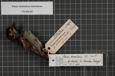 | Keywords: Naturalis Biodiversity Center - RMNH.AVES.57204 1 - Passer domesticus domesticus (Linnaeus, 1758) - Ploceidae - bird skin specimen.jpeg  artwork Dimensions artwork Document type Ploceidae Passer Individual count 1 Infraspecific epithet domesticus Infraspecific rank Institution Naturalis Kind of unit artwork Kind of unit specimen skin Life stage Portugal bij Setubal Z van Lissabon Medium artwork Nomenclatural code Locality remark On old label Bij Setubal z/v Lissabon Occurrence ID page Other fields Other versions artwork Permission license Naturalis donation CC-0 Publication location Scientific name Passer domesticus domesticus Linnaeus 1758 Scientific name authorship Linnaeus 1758 male Source url http //bioportal naturalis nl Specific epithet domesticus State or province Subject keywords artwork Subject keywords publication Title artwork Title publication Type status Uploaded with GWToolset Naturalis_Biodiversity_Center_-_RMNH AVES 57204_1_-_Passer_domesticus_domesticus_ Linnaeus _1758 _-_Ploceidae_-_bird_skin_specimen http //medialib naturalis nl/file/id/RMNH AVES 57204_1/format/large Media donated by Naturalis Biodiversity Center Songbird specimens at Naturalis Biodiversity Center Passer domesticus Passer |