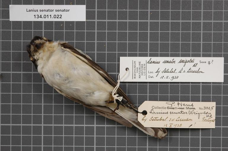 | Keywords: Naturalis Biodiversity Center - RMNH.AVES.58018 1 - Lanius senator senator Linnaeus, 1758 - Laniidae - bird skin specimen.jpeg  artwork Dimensions artwork Document type Laniidae Lanius Individual count 1 Infraspecific epithet senator Infraspecific rank Institution Naturalis Kind of unit artwork Kind of unit specimen skin Life stage Portugal bij Setubal Z van Lissabon Medium artwork Nomenclatural code Sex remark On Hens label 'female' Occurrence ID page Other fields Other versions artwork Permission license Naturalis donation CC-0 Publication location Scientific name Lanius senator senator Linnaeus 1758 Scientific name authorship Linnaeus 1758 female Source url http //bioportal naturalis nl Specific epithet senator State or province Subject keywords artwork Subject keywords publication Title artwork Title publication Type status Uploaded with GWToolset Naturalis_Biodiversity_Center_-_RMNH AVES 58018_1_-_Lanius_senator_senator_Linnaeus _1758_-_Laniidae_-_bird_skin_specimen http //medialib naturalis nl/file/id/RMNH AVES 58018_1/format/large Media donated by Naturalis Biodiversity Center Songbird specimens at Naturalis Biodiversity Center Lanius senator Lanius |