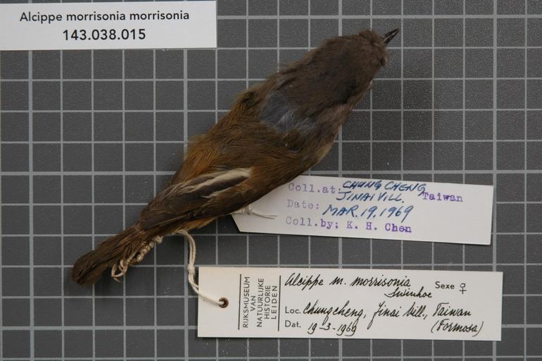 | Keywords: Naturalis Biodiversity Center - RMNH.AVES.59105 1- - Alcippe morrisonia morrisonia Swinhoe, 1863 - Timaliidae - bird skin specimen.jpeg artwork Dimensions artwork Document type Timaliidae Alcippe Individual count 1 Infraspecific epithet morrisonia Infraspecific rank Institution Naturalis Kind of unit artwork Kind of unit specimen skin Life stage Taiwan Chung Cheng Jinai Vill Medium artwork Nomenclatural code General remarks Label Chen also contains some text in Japanese / Tiwanese Country remark On RMNH label Taiwan Formosa Occurrence ID page Other fields Other versions artwork Permission license Naturalis donation CC-0 Publication location Scientific name Alcippe morrisonia morrisonia Swinhoe 1863 Scientific name authorship Swinhoe 1863 female Source url http //bioportal naturalis nl Specific epithet morrisonia State or province Subject keywords artwork Subject keywords publication Title artwork Title publication Type status Uploaded with GWToolset Naturalis_Biodiversity_Center_-_RMNH AVES 59105_1 _-_Alcippe_morrisonia_morrisonia_Swinhoe _1863_-_Timaliidae_-_bird_skin_specimen http //medialib naturalis nl/file/id/RMNH AVES 59105_1/format/large Media donated by Naturalis Biodiversity Center Songbird specimens at Naturalis Biodiversity Center Alcippe morrisonia Alcippe |